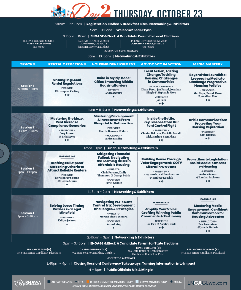 A high-energy start with the ENGAGE & Elect Candidate Forum featuring local leaders, followed by tracks on Rental Operations, Housing Development, Advocacy in Action, and Media Mastery. Sessions dive into rental compliance, housing affordability, GOTV efforts, and crisis communication, while Learning Labs provide hands-on training in testimony, screening criteria, lease compliance, and media engagement. The day closes with a statewide candidate forum and our Public Officials Mix & Mingle.