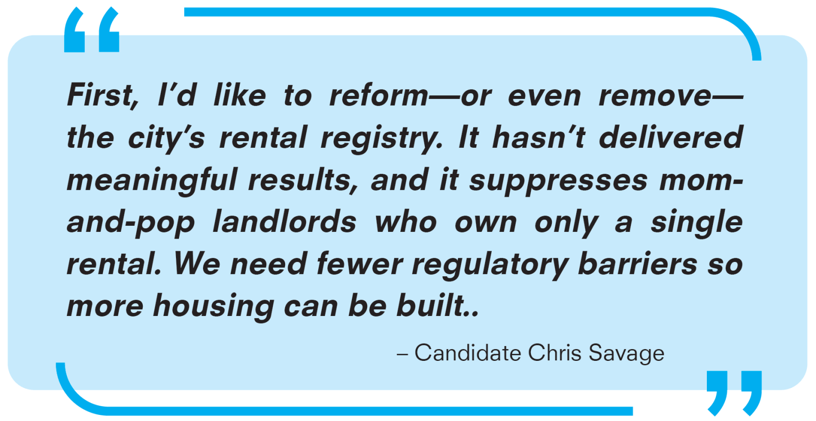 A: First, I’d like to reform—or even remove—the city’s rental registry. It hasn’t delivered meaningful results, and it suppresses mom-and-pop landlords who own only a single rental. We need fewer regulatory barriers so more housing can be built.