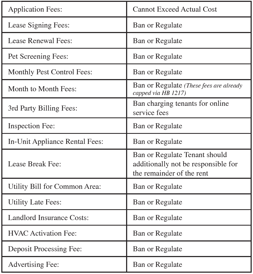 This is obviously a concerning list due to the fact that this goes far beyond any kind of specific fee regulation the nation has ever seen. To give some perspective, the following is a list of the more common fees that have been regulated in other states.