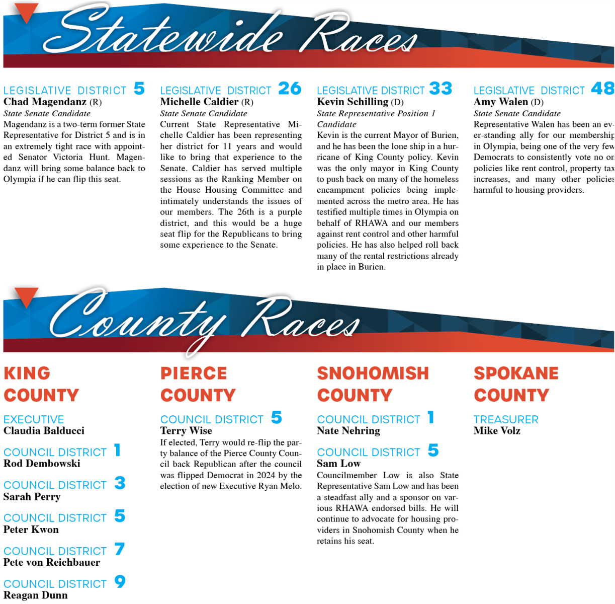 Inside this guide, you’ll find the candidates we believe will have the greatest positive impact on rental housing across Washington. Our Government Affairs team reviewed campaigns from every district to identify the strongest advocates for housing providers. In some races, you’ll see multiple recommendations—offering you the opportunity to support the platform that resonates most with you. In other races, we found no standout candidates on rental housing issues, and those have been left blank.