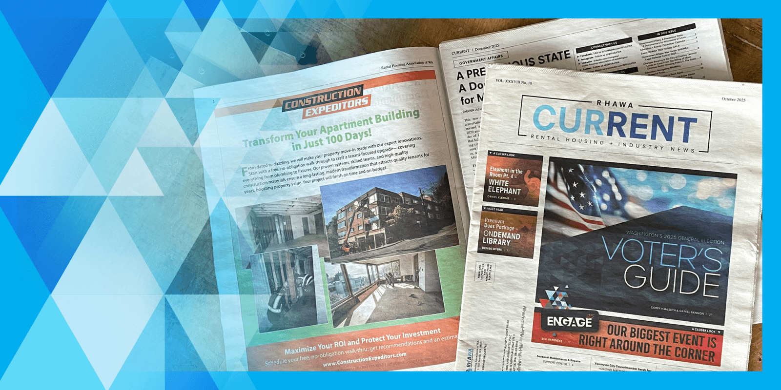 RHAWA’s monthly newspaper is the leading rental housing industry news journal in Washington. It reviews industry-related legislative activity, vacancy trends, property management and maintenance information, as well as business and personal finance. CURRENT is distributed to 7,000 decision makers and is also available online to view, save, print, and share! View the 2026 Print Advertising Agreement here: